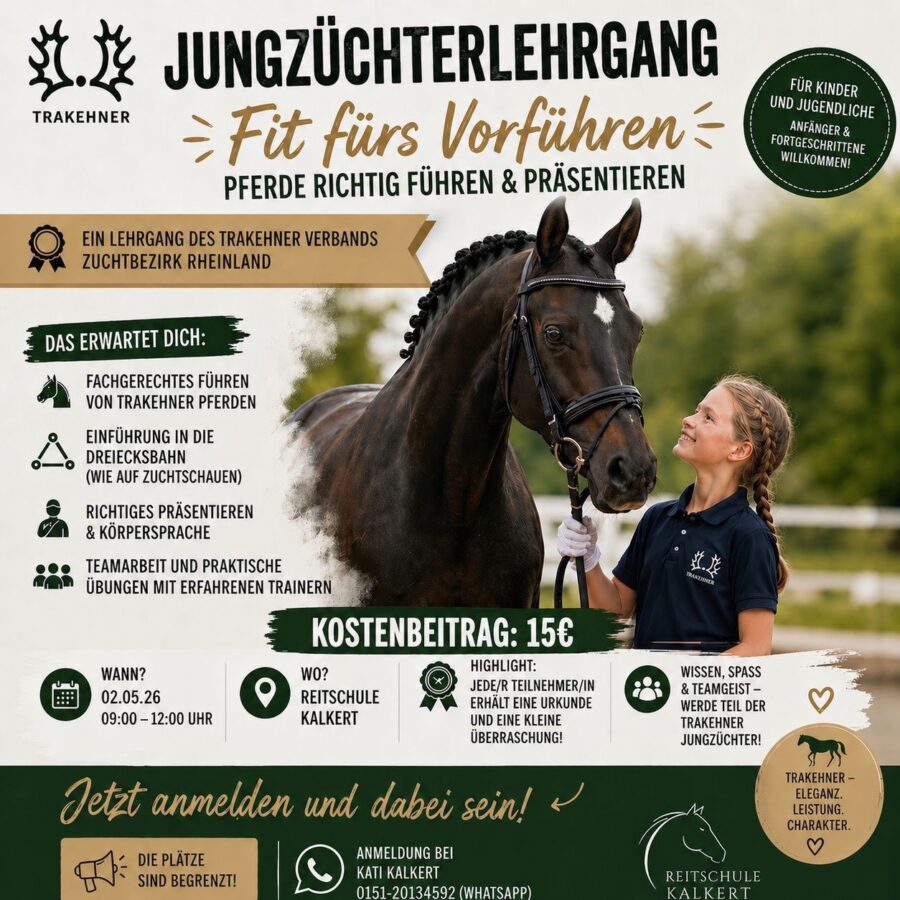 Der Jungzüchterlehrgang findet am 2. Mai 2026 in der Reitschule Kalkert statt und läuft von 09:00 bis 12:00 Uhr. Zum Abschluss erhält jeder Teilnehmer eine Urkunde sowie eine kleine Überraschung.