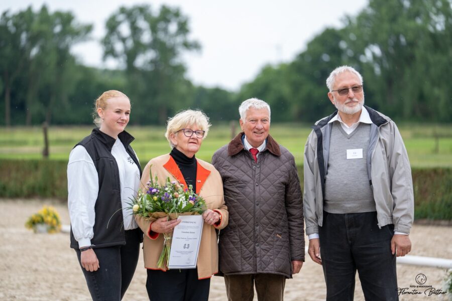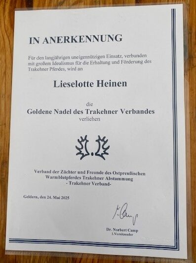 In Anerkennung ihres langjährigen uneigennützigen Einsatzes und ihres großen Idealismus für die Erhaltung und Förderung des Trakehner Pferdes wurde Lieselotte Heinen mit der Goldenen Ehrennadel des Trakehner Verbandes ausgezeichnet. Die Laudatio hielt Dr. Hans-Peter Karp, 1. Stellvertretender Vorsitzender des geschäftsführenden Vorstandes, der auch die Ehrung überreichte. Lieselotte Heinen hat sich mit großem Engagement in der Trakehnerzucht hervorgetan. Sie unterstützte die züchterische Arbeit ihres Mannes und führte nach dessen Tod das Gestüt Heinen-Bönninghardt weiter. Mit Passion und Geschick hat sie die Zucht der Trakehnerpferde über Jahrzehnte hinweg geprägt und das Gestüt zu einer Institution gemacht.