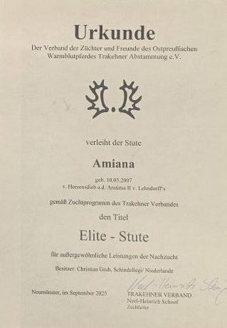 Im September 2025 wurde der St.Pr. u. Pr.St. Amiana gemäß dem Zuchtprogramm des Trakehner Verbandes der Titel Elitestute verliehen – eine Auszeichnung für außergewöhnliche Leistungen in der Nachzucht. Diese Ehrung krönt eine erfolgreiche Zuchtgeschichte, die über drei Länder hinweg geführt hat und beispielhaft für die internationale Bedeutung der Trakehnerzucht steht.