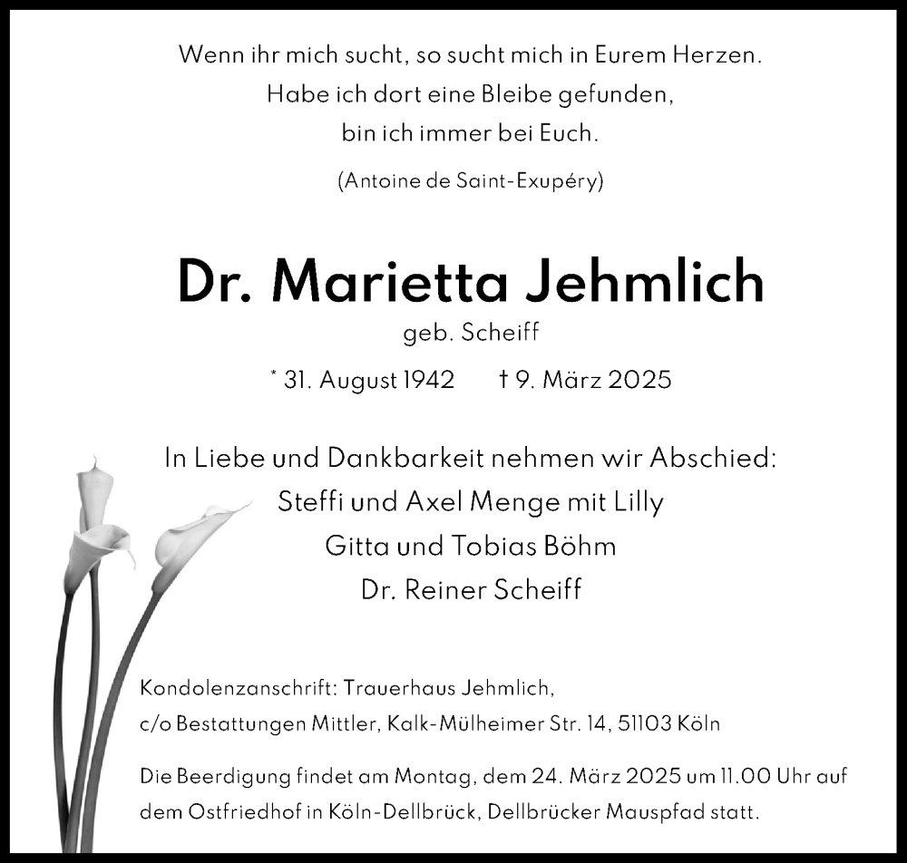 Mariettas plötzlicher Tod reißt eine große Lücke in unsere Trakehner Familie. Ihre angenehme und freundliche Art wird sehr vermisst. Unser tiefes Mitgefühl gilt ihren Angehörigen und Freunden.